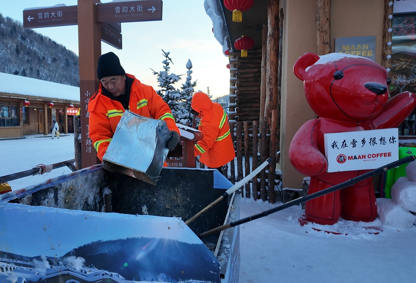 责任主谈主员在“中国雪乡”景区计帐垃圾。(受访者供图)