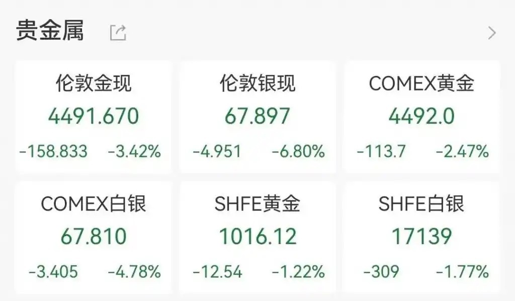 现货白银跌 6.8%,报 67.897 好意思元 / 盎司,本周累计着落超 15%;COMEX 白银期货跌 4.78%,报 67.810 好意思元 / 盎司,本周累跌超 16%。