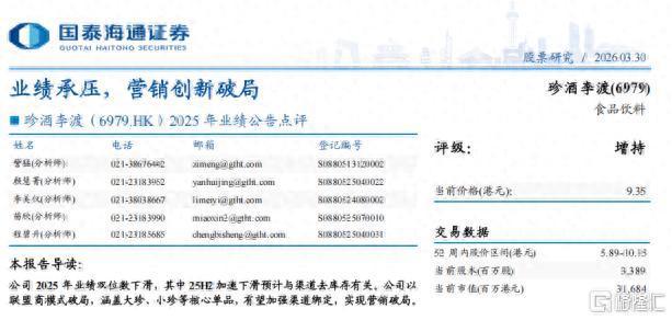 2026年以来,公司股价连续谨慎走势。规模3月31日,珍酒李渡股价报9.39港元/股,较岁首涨超8%,充分彰显本钱商场对公司谋略韧性、鼎新政策和永久投资价值的认同。