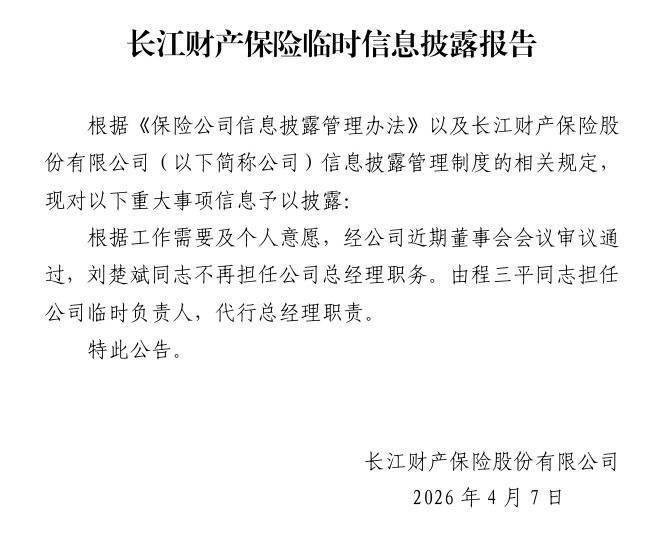 4月7日,长江财险发布公告称,确认职责需要及个东说念倡导愿,经公司近期董事会会议审议通过,刘楚斌不再担任公司总司理职务。由程三平担任公司临时正经东说念主,代行总司理职责。