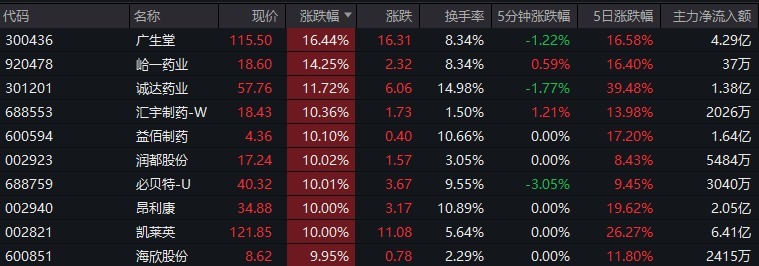此外,贤明医药20%涨停,毕得医药、艾迪药业、益方生物、广生堂、诚达药业、必贝特、西点药业、百利天恒等涨超10%,益佰制药、润王人股份、昂利康、海欣股份等涨停。